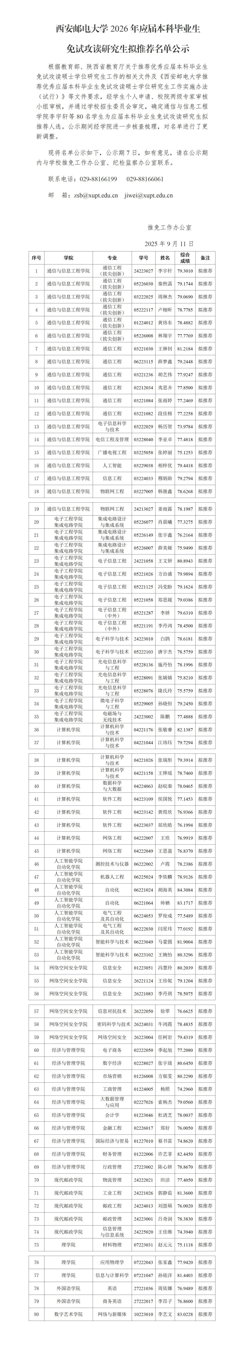 西安邮电大学2026年应届本科毕业生免试攻读研究生推荐名单公示