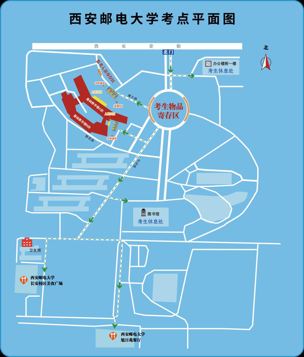 我校考场设在长安校区西区基础教学楼A段和B段。考试期间开放学校西区北门(西长安街),示意图如下。请考生提前了解我校考点具体位置、周边环境和赴考路途交通状况。